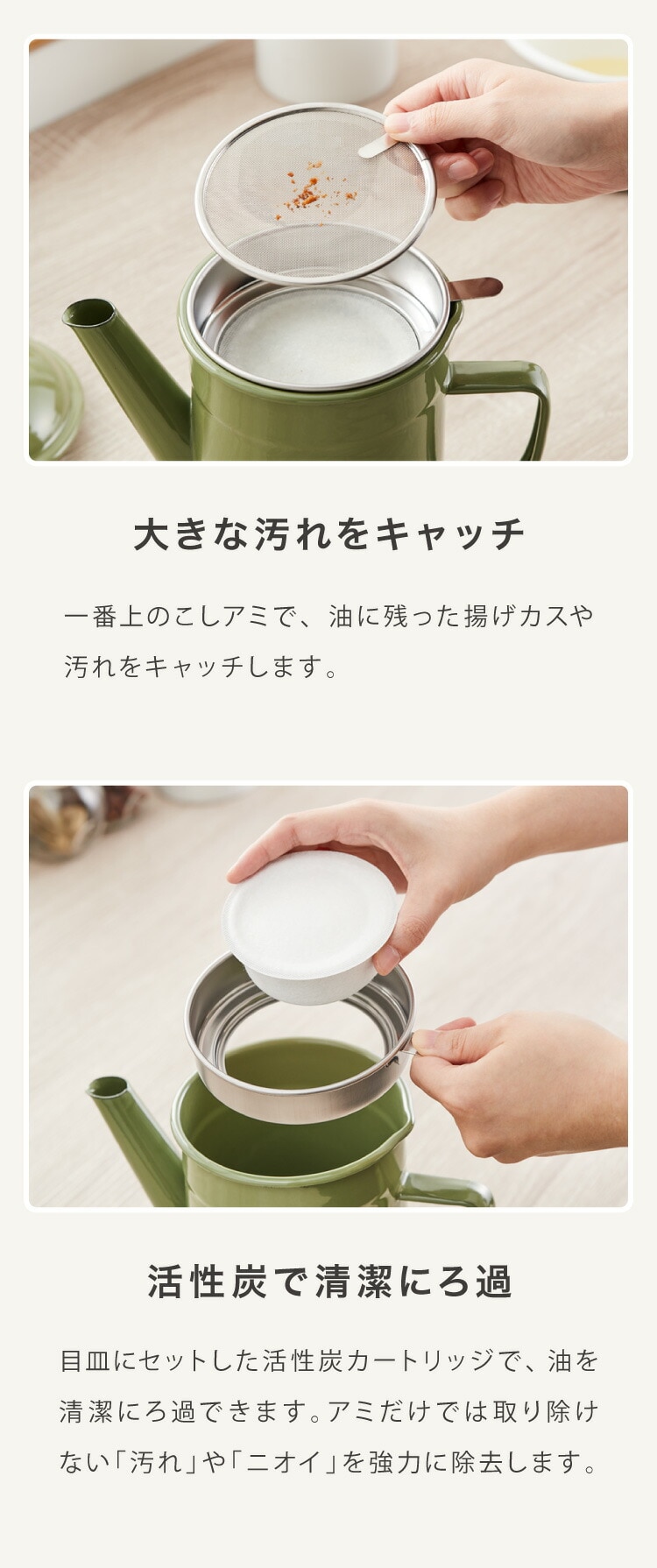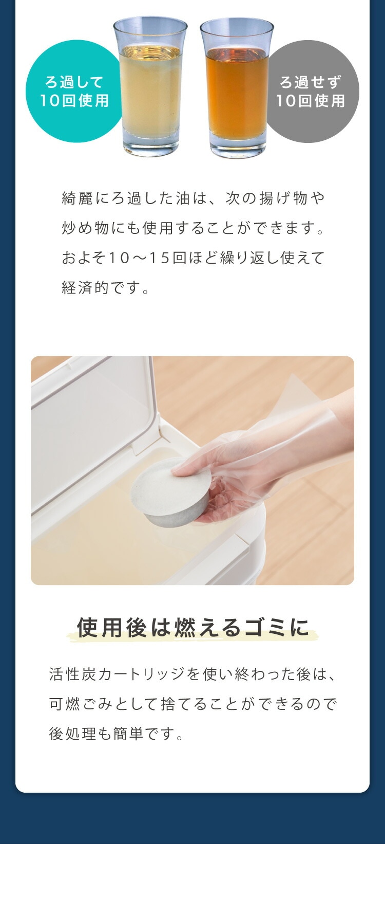 ※ろ過できる油は、一般的なサラダ油を想定しています。その他の油や、温度が下がり過ぎた油はろ過に時間がかかったり、詰まる可能性がございます。