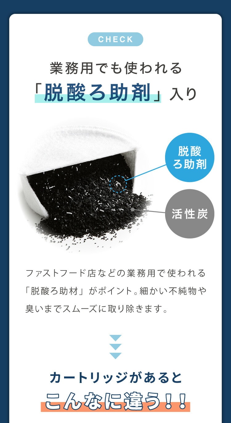 ファストフード店でも使われている仕様で、細かい不純物や臭いまでスムーズに取り除きます。