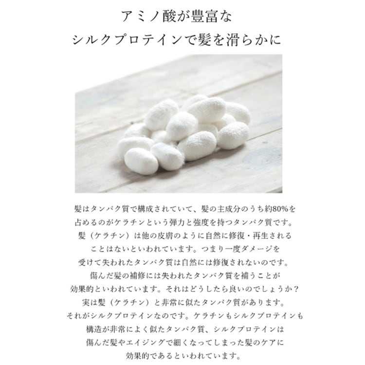 シルクプロテインは髪の成分によく似たたんぱく質を含んでおりダメージケアに効果的であると言われています。
