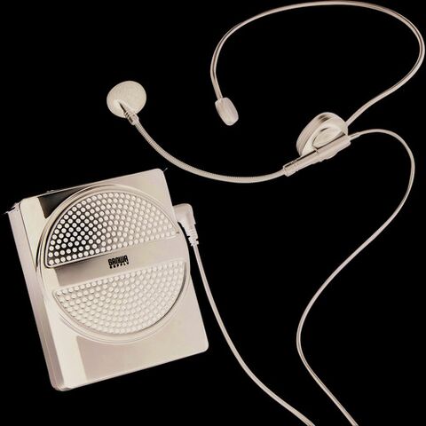 ●体にスピーカーとヘッドマイクを装着することで両手が自由に使えるハンズフリー拡声器スピーカーです。