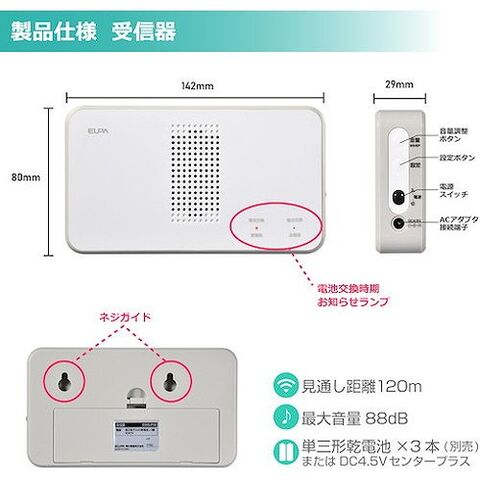 ●電池寿命:受信器約1年(1日に10回、音量4、ピンポン高音、音のみで使用) ※アルカリ乾電池使用時押ボタン送信器 約2年(1日に10回使用)