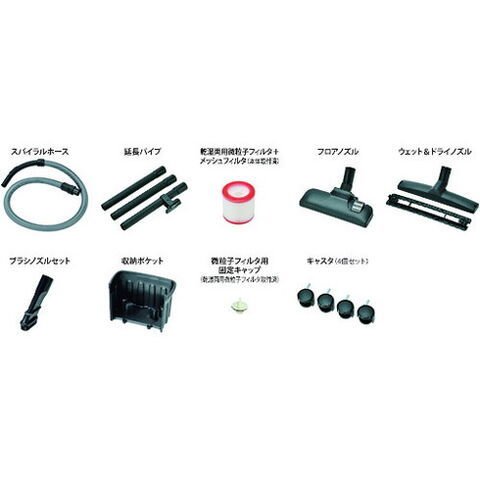 ●ホース●延長パイプ●微粒子フィルタ+メッシュフィルタ+固定キャップ●ノズル:フロア、ウェット&ドライ、ブラシ●収納ポケット