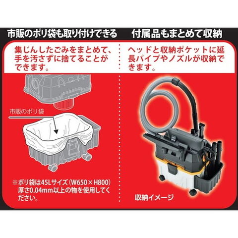●水も吸える乾湿両用の集塵機です。●付属品をヘッドと収納ポケットに入れられコンパクトに収納でき、付属品の紛失を防止します。●市販のポリ袋も取り付け可能で、集じんしたゴミに触れることなく廃棄することが可能です。●微粉塵に対応できる微粒子フィルタ付です。●豊富な先端ノズルで多彩なシーンに対応できます。●軽くてサビないプラスチックタンクです。