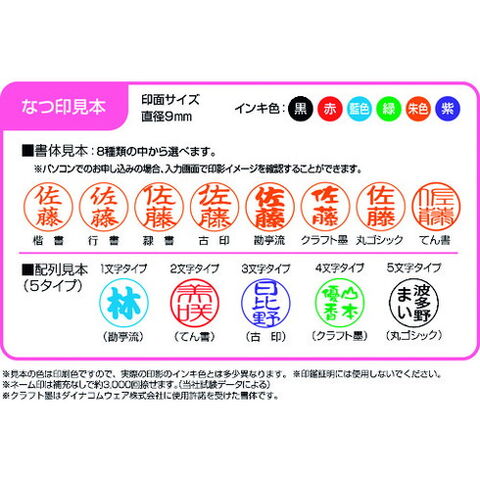 ●書体は、楷書、行書、隷書、古印体、勘亭流、クラフト墨、丸ゴシック、てん書の8書体。