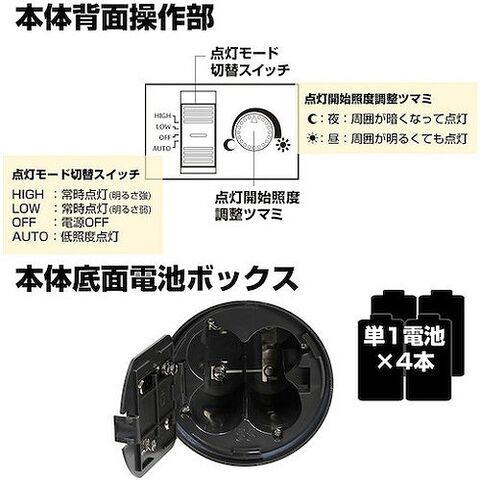●選べる点灯モード・常時点灯:二段階切替 HIGH:明るさ強で常時点灯します LOW:明るさ弱で常時点灯します・OFF:常時消灯します・AUTO:自動的に検知し、約12秒間点灯します。