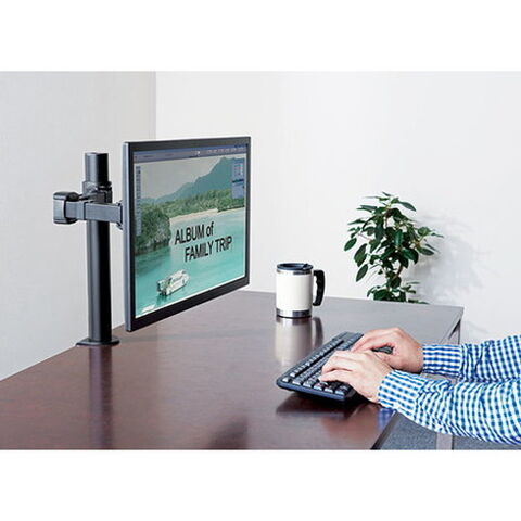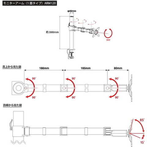 ・対応規格:VESA規格 100mm/75mm・可動範囲:モニター傾斜 上-85°/下15°・可動範囲:関節軸回転 左90°(3ヶ所)/右90°(3ヵ所)・可動範囲:中心軸回転 左180°/右180°・取り付け可能天板:厚さ:15mm~88mm、奥行:108mm以上、幅:100mm以上