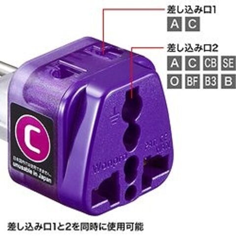 ●上面の1口はA・B・Cタイプが差し込めるようになっています。2つのプラグを同時に差し込み、変換することができます。