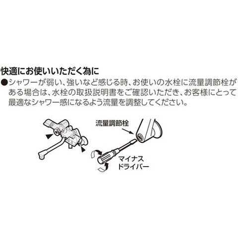 ●シャワーが弱い、強いと感じる時は水栓の流量調整弁で最適なシャワー感になるよう調節して下さい。