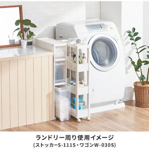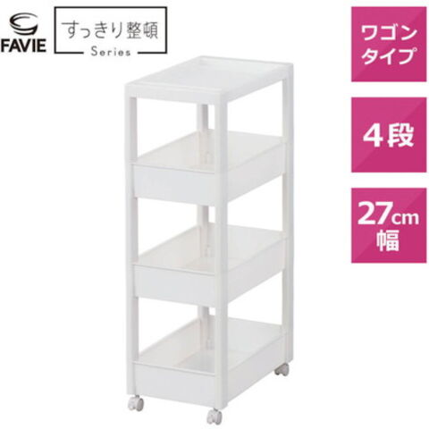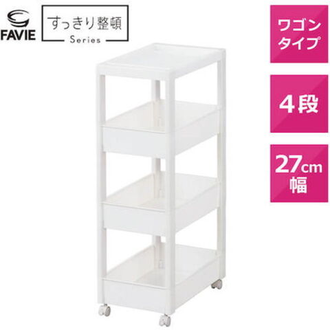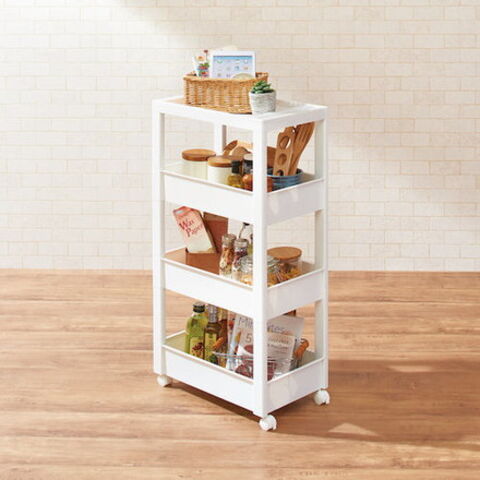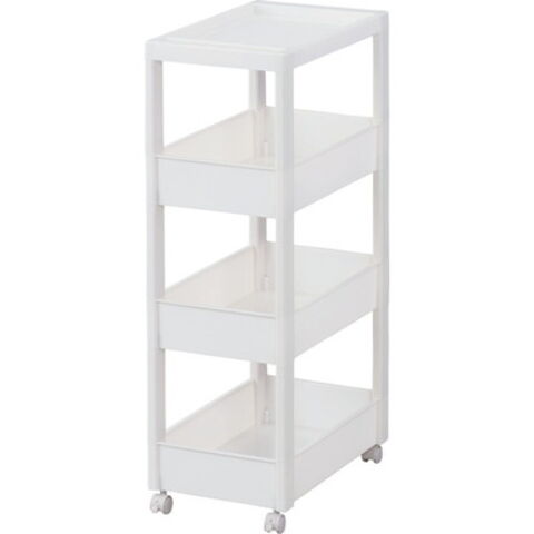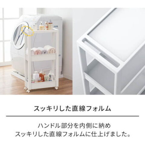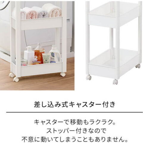 ●スクエア柱、ハンドルを内側に納めたスッキリ形状天板により、ストッカーとコーディネートできるデザインにしました。●フラットなデザインのストッカーやボックスと組み合わせて使っても、相性抜群です。●差し込み式キャスター付きです。●スタイリッシュなホワイトカラーで、キッチンや洗面所などあらゆるシーンでのストック収納におすすめです。●幅27cmのワイドタイプです。