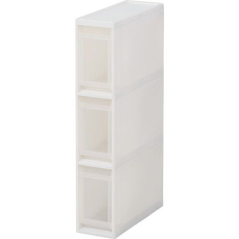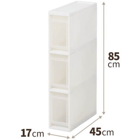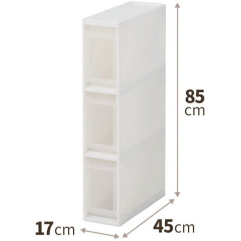 ●耐荷重(kg):24●色:ホワイト●段数(段):3●外形寸法(mm)間口:170●外形寸法(mm)奥行:450●外形寸法(mm)高さ:850●引き出しサイズ:スリムM×3個●耐荷重(kg/段):7●天板耐荷重(kg):3●有効内寸(mm)間口:110~130●有効内寸(mm)奥行:400●有効内寸(mm)高さ:230