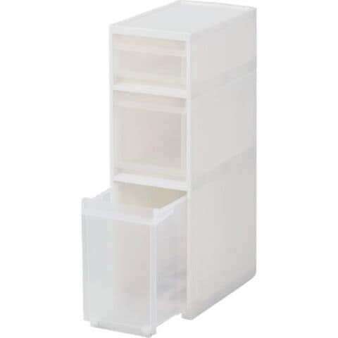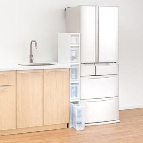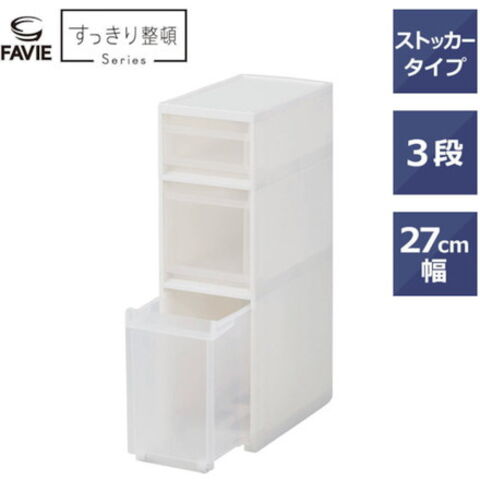 ●同じ幅のスキピタワゴンと連結可能です。●引出しは操作しやすい様に上・下に取手付です。●ストッカー引出し内側または前面外側にセット可能な小物ポケット(1個)付きです。●スタイリッシュなホワイトカラーで、キッチンや洗面所などあらゆるシーンでのストック収納におすすめです。●幅27cmのワイドタイプです。