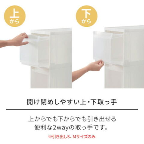 ●完成品●ワゴン(別売)1個まで連結可能●引き出し内寸(間口×奥行×高さ):205~225×400×125mm(Sサイズ)、205~225×400×230mm(Mサイズ)、195~215×400×345mm(Lサイズ)●容量:【引出しワイドSサイズ】12.1リットル、【引出しワイドMサイズ】21.9リットル、【引出しワイドLサイズ】31.1リットル●収納目安:【引出しSサイズ】350ml缶・トイレットペーパー・CDスリムケースなど、【引出しMサイズ】500mlペットボトル・洗濯剤ボトル・レトルト箱・DVDソフトなど、【引出しLサイズ】2リットルペットボトル・キッチンペーパー・シリアル箱など●耐荷重:【引出しワイドSサイズ】5kg、【引出しワイドMサイズ】7kg、【引出しワイドLサイズ】17kg