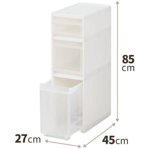 ●耐荷重(kg):32●色:ホワイト●段数(段):3●外形寸法(mm)間口:270●外形寸法(mm)奥行:450●外形寸法(mm)高さ:850●引き出しサイズ:ワイドS、M、L×各1個●耐荷重(kg/段):5(S)、7(M)、17(L)●天板耐荷重(kg):3●有効内寸(mm)高さ:125、230、345●有効内寸(mm)奥行:400●有効内寸(mm)間口:205~225、195~215