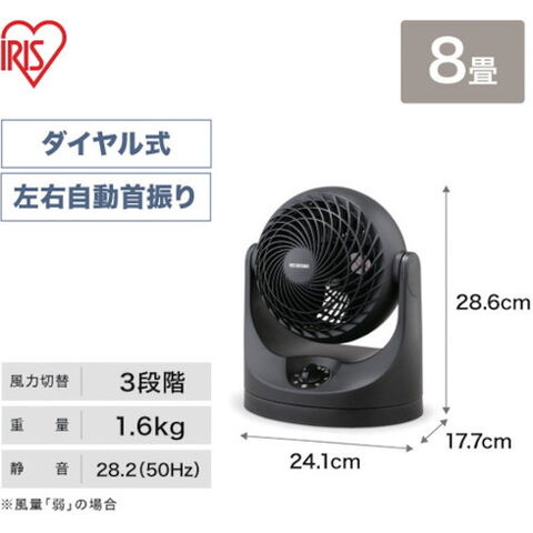 ●電源(V):単相100●消費電力(W)(50/60Hz):33/32●ハネ径(cm):15●色:ブラック●幅(mm):241●奥行(mm):177●高さ(mm):286●電源コード長さ(m):1.4●首振り:上下112.5°、左右360°●風量調節:3段階●適合床面積:8畳●標準消費電力料金(50/60Hz):0.89/0.86円/h●最大風量(50/60Hz):10.6[[M3]]/min/10.8[[M3]]/min