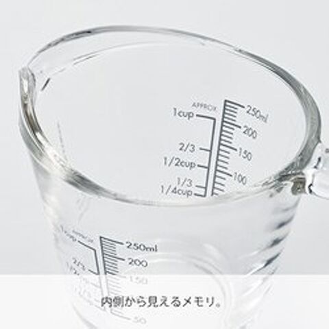 ●計量カップを使うときの目線を考え、上からのぞいたときに見やすくはっきり見えるメモリをつけました。