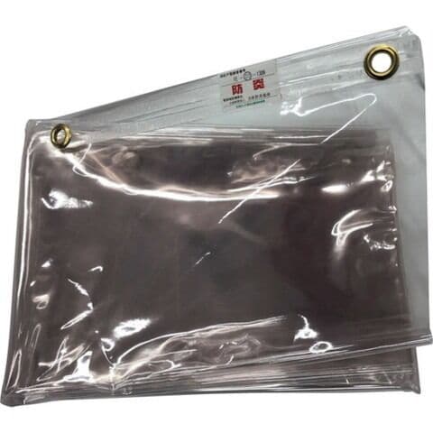 ●防炎認定品●防炎ラベル付き●RoHS2.0対応品●酸素指数27以上●厚み:0.3mm●色:透明●上部折り返し、真鍮ハトメつき●三方は切りっぱなし