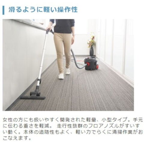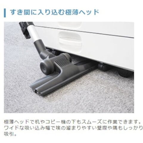 ●極薄ヘッドでコピー機の下やベッドの下などスムーズに作業できます。●使ってみると分かる驚きの軽さ、現場の方々に喜んで頂ける商品です。●突起物最小限に抑えた本体デザインと衝撃吸収バンパーにより、清掃作業中に起こりうる衝撃から対象物を守ります。●電源コードの断線を防止する3つのツールを標準装備しています。●パワーセレクトで運転音の調整が出来ます。●軽くラクに作業できるように、使いやすさにこだわっております。
