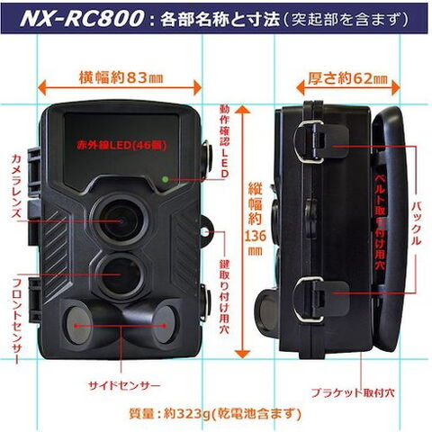 ●幅(mm):83●奥行(mm):62●高さ(mm):136●最大画素数(万):800●色:ブラック●電源:単三アルカリ乾電池8本。または4本。(別売)●解像度:(写真)20MP/16MP/12MP/8MP/5MP/3MP/1MP、(ビデオ)3840×2160P、2688×1520P:20FPS、1920×1080P/1280×720P、1280×720P:60FPS、848×480P/720×480P、640×480P/320×240P●電源(V):単三アルカリ乾電池8本。または4本。(別売)●PIR検出距離(m):最大約20※25℃で計測時の値。気温等により変化●PIR検出角度(°):最大約120●トリガー時間(秒):約0.5●トリガー間隔(秒~分):5~60●待ち受け時間(ヶ月):最大約12※単三アルカリ乾電池8本使用時(使用環境、設定状況で大幅に変化)●画素数:800万画素