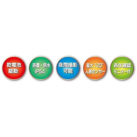 ●イメージセンサー:1/2.5 CMOS●画面サイズ:2.4型TFTカラー液晶●ファイル形式:JPG/AVI●記録媒体:microSDカード Class6以上 最大32GB●防塵防水機能:IP54●赤外線LED:40個(不可視光)●赤外線到達距離:最大約20m●TV出力:コンポジット出力