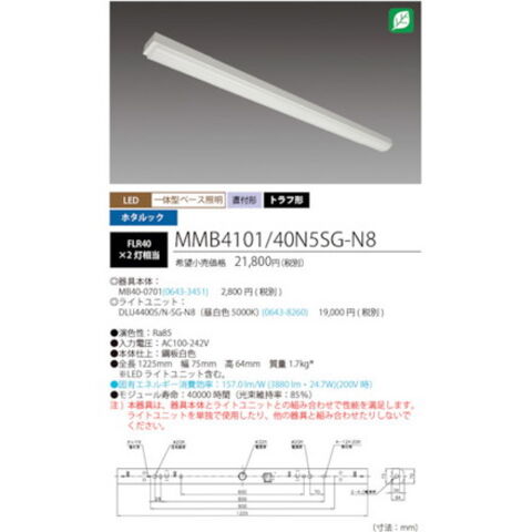 ●明るさ(lm):3880●光源色:昼白色●幅(mm):75●長さ(mm):1225●高さ(mm):64●消費電力(W):24.7●定格寿命(時間):40000●電圧(V):AC100~242●消費効率(lm/W):157.0