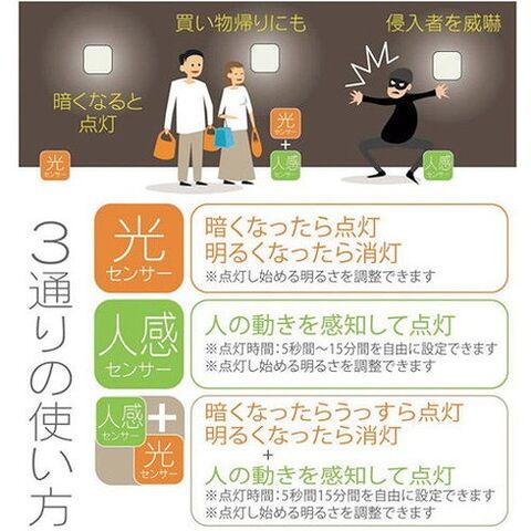 ●明るさセンサー+人感センサーモードにすれば、暗い時にうっすら点灯を続け、人が近づくと明るく点灯します。
