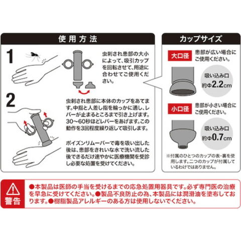 ●蚊や毒虫などに刺された時、毒液や毒針を吸引作用で抽排出する応急手当器具です。●コンパクトで片手で使えます。●選べる2種類の吸い出しカップです。●便利なカラビナ付属、ピンポイントで吸い出します。