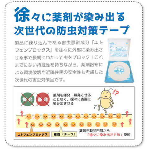 ●片面テープ/テープ中央にミシン目入り●害虫忌避成分エトフェンプロックスを練り込んだフィルム●対象害虫:アリ類、クモ類、ケムシなどの不快害虫●効果範囲:フィルム面