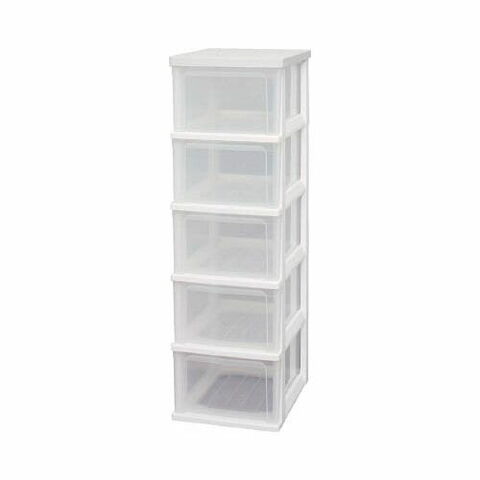 ●中身が見えるワイドチェストです。●引出し:5●間口(mm):324●奥行(mm):410●高さ(mm):1018●収納の目安:Yシャツなら4枚、セーターなら2枚、バスタオルなら2枚●引出し内寸(mm)間口×奥行×高さ:253×355×173●天板耐荷重:10kg●天板色:ホワイト●天板:プリント紙化粧パーティクルボード●本体・引き出し:ポリプロピレン(PP)