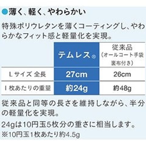 ●ポリウレタン製で、天然ゴム手袋に比べて軽く柔らかい。