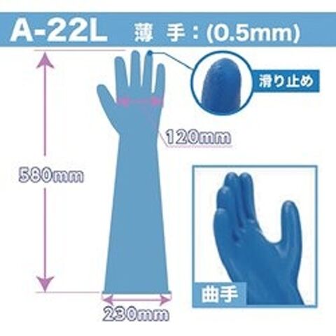 ●合成ゴムの特殊配合によって作られた画期的な超強力耐酸手袋で、長時間の使用にも目を疲れさせない独特なカラー(ライトブルー)です。