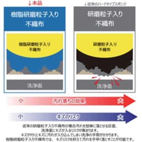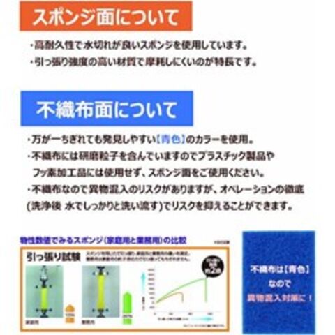 ●〇樹脂研磨粒子で汚れを落とし、洗浄面をキズつけにくい!●〇不織布面・スポンジ面ともに業務用高耐久素材を採用することで長くご使用頂け、現場での交換頻度を下げ、最終的なコストUPを抑えます。