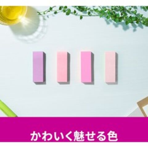 ●色:アイリスインフュージョン・ポジティブリィピンク・トロピカルピンク・ピンク●縦(mm):75●横(mm):25●パック入数:90枚×24パッド●サイズ:75mm×25mm●枚数:90枚×24パッド●外箱入数:10個●紙箱●カラフルな4色のセットなので、色で識別したり、書いた部分を目立たせたりすることができます。