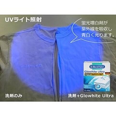 ●酸素系漂白剤で汚れをきれいにして白くみせるだけでなく、紫外線を吸収すると青白く光る蛍光増白剤を合わせることで、より白く見せます。