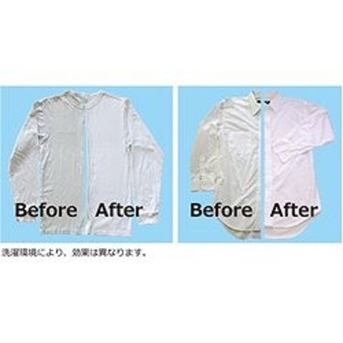 ●水洗い可能な白い衣類のみにご使用ください。【使えないもの】生成りやオフホワイトなどの衣類、色・柄物の衣類