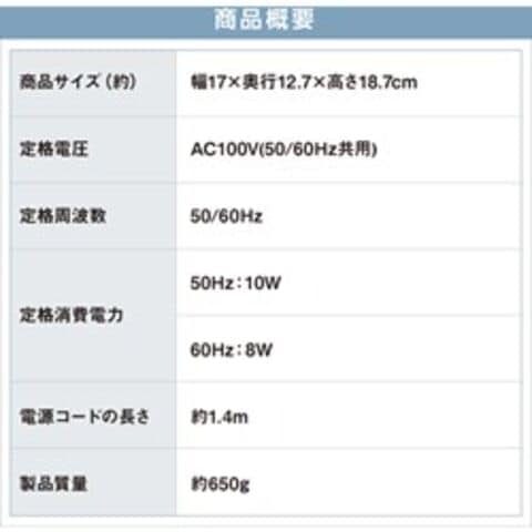 ●電源(V):単相100●消費電力(W)(50/60Hz):10/8●ハネ径(cm):10●幅(mm):170●奥行(mm):127●高さ(mm):187●電源コード長さ(m):約1.4●風量調節:3段階●首振り:上下(手動6段階)●設置タイプ:卓上●標準消費電力料金(50Hz):0.3円/h●標準消費電力料金(60Hz):0.3円/h●色:ブルー●ABS、PP等
