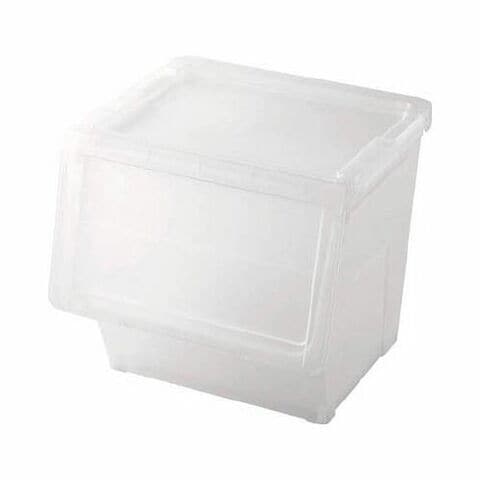 ●フラップ式スライド扉で開口部が広いため、物の出し入れが非常にスムーズに行えます。●別売りのキャスターを使えば移動も楽に行えます。●他のサイズと組み合わせて自分好みの収納スペースが作れます。スプレー缶、軍手、作業服などの在庫ストック●色:クリア●外形寸法(mm)間口×奥行×高さ:450×420×410●開口部寸法(mm)縦×横:210×380●本体、フタ:ポリプロピレン●耐荷重6Kg、L積み重ね段数2段、SML組合せ積み重ね3段まで