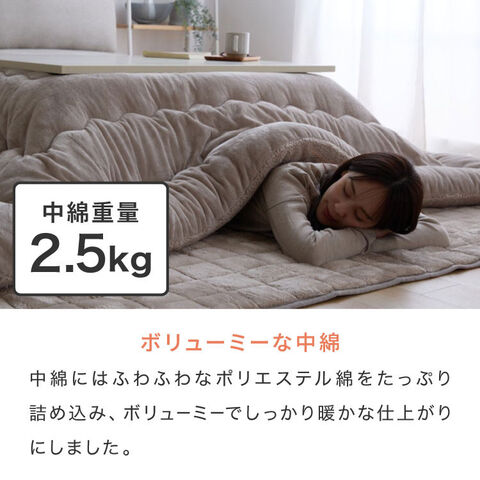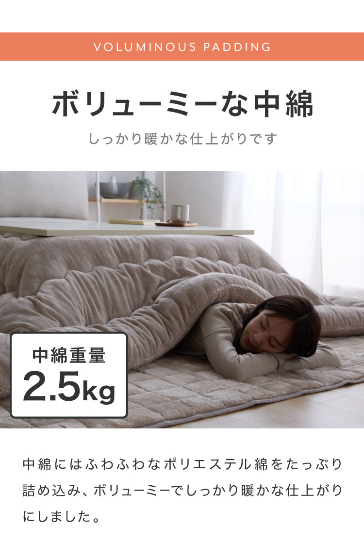 中綿をたっぷり詰めた2.5kgの厚手設計で、冷気をしっかり遮断。暖かさを逃さず、節電対策にも効果的です。