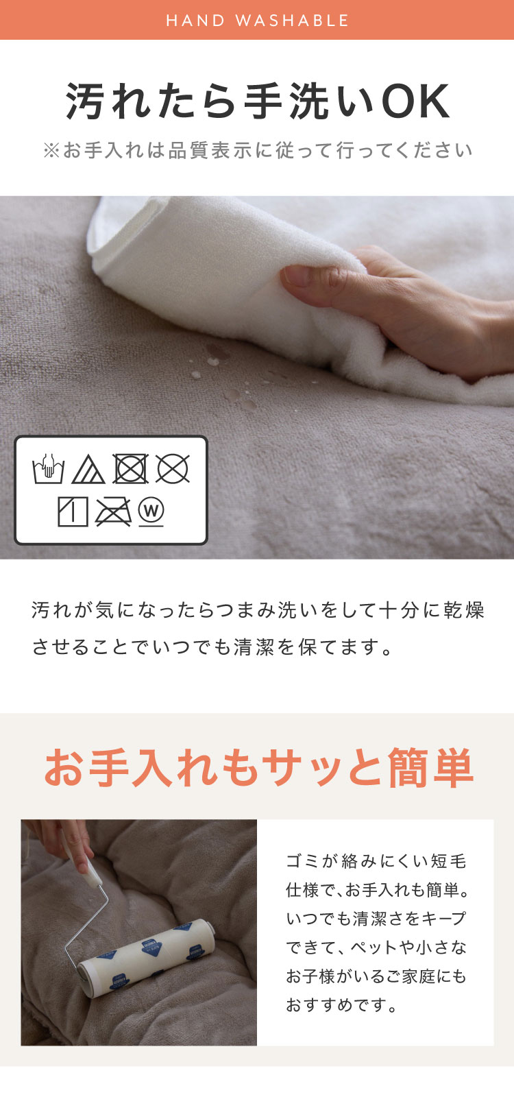 汚れが気になったときは手洗いで対応可能。いつでも清潔を保てるので、ペットや小さなお子様がいるご家庭にもおすすめです。