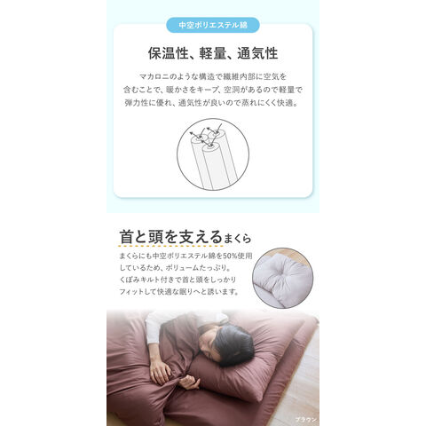 まくらにも中空ポリエステル綿を50%使用しているため、ポリュームたっぷり。くぼみキルト付きで首と頭をしっかりフィットして快適な眠りへと誘います。