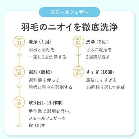 羽根軸が6.5cm未満の羽根をスモールフェザーといい、腹部などに生えているため、翼に生えているフェザーと比べて、柔らかく軽いのが特長です。
