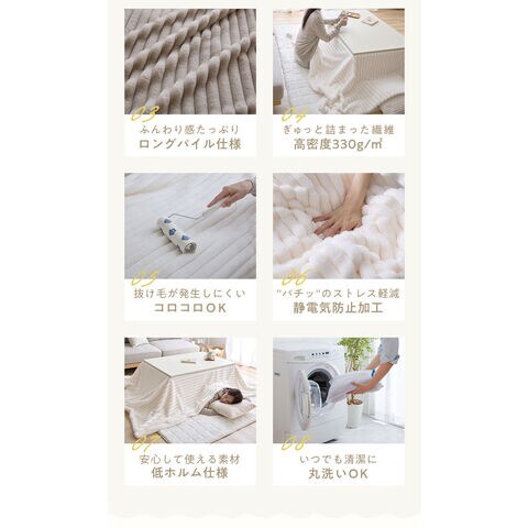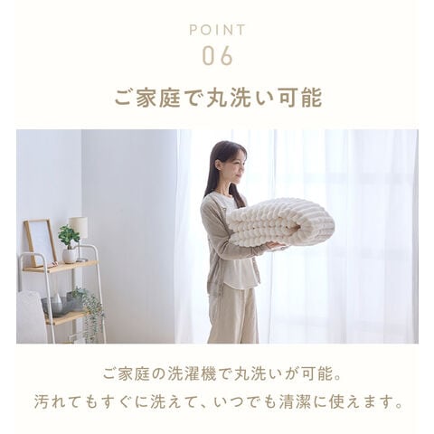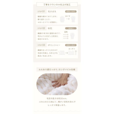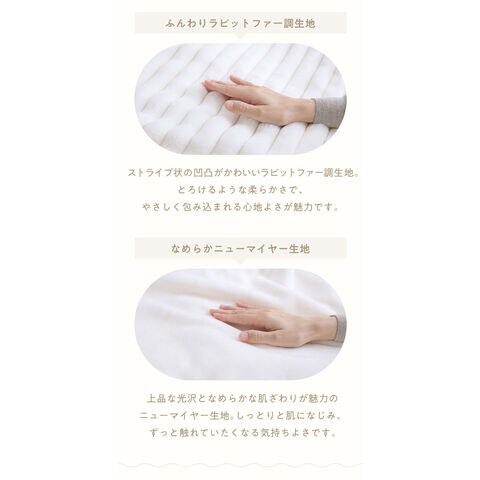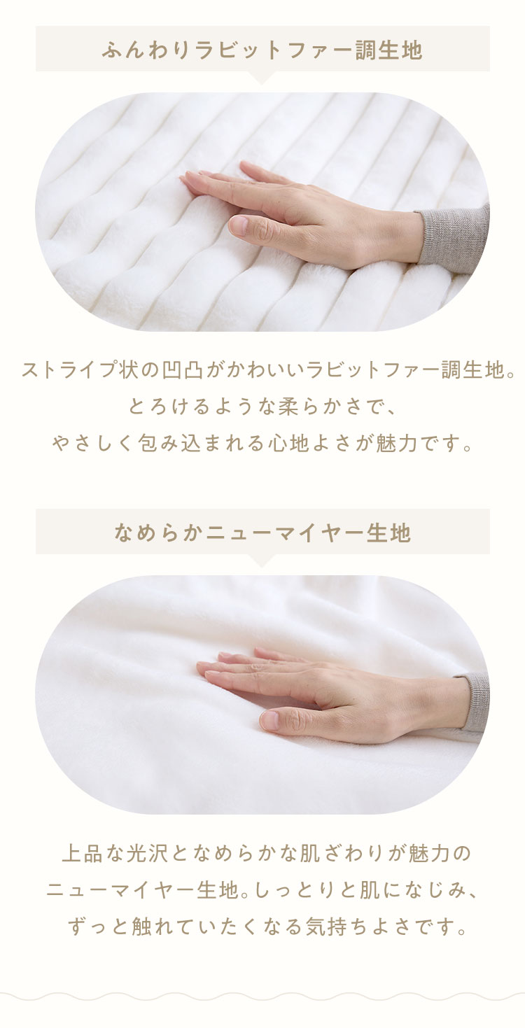 表面は針抜きストライプのラビットファー風ポリエステル生地(330g/平方メートル)を使用し、もこもこした立体感とふわふわの肌触りを実現。