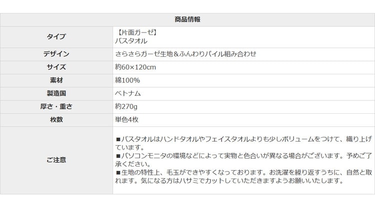 ガーゼタオル バスタオル 4枚セット 全10色 薄手 60×120cm 片面ガーゼ タオル しっかり吸水 速乾 無地 コンパクト ベビー 赤ちゃん おくるみ まとめ買い ガーゼ【送料無料】