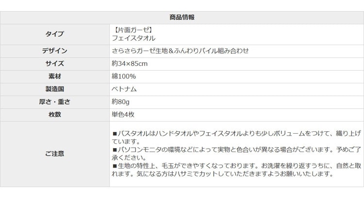 ガーゼフェイスタオル4枚 ガーゼタオルフェイスタオル 4枚セット 全10色 薄手 34×85cm 片面ガーゼ タオル しっかり吸水 速乾 無地 コンパクト ベビー 赤ちゃん まとめ買い【送料無料】