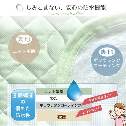 「布団と接する内面はポリウレタンコーティングによって水分を通さず、中の布団を濡らしません。」