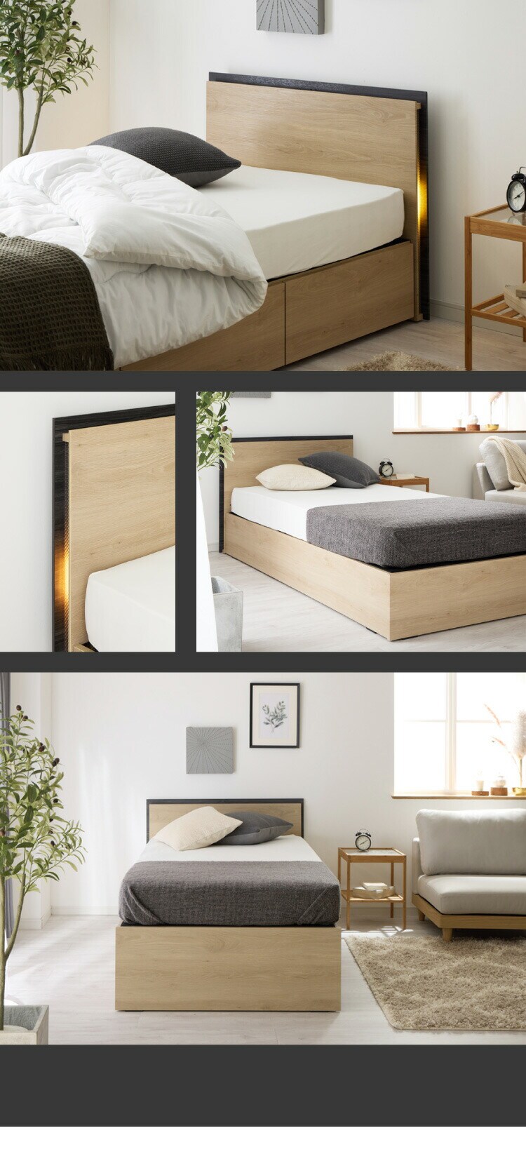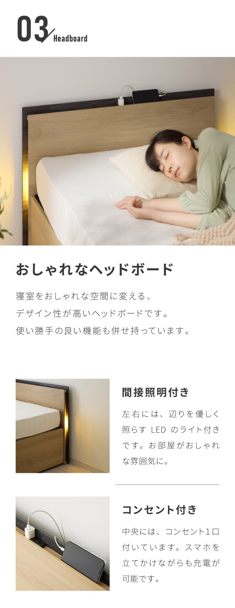 ・ヘッドボード側面にLEDライト付き