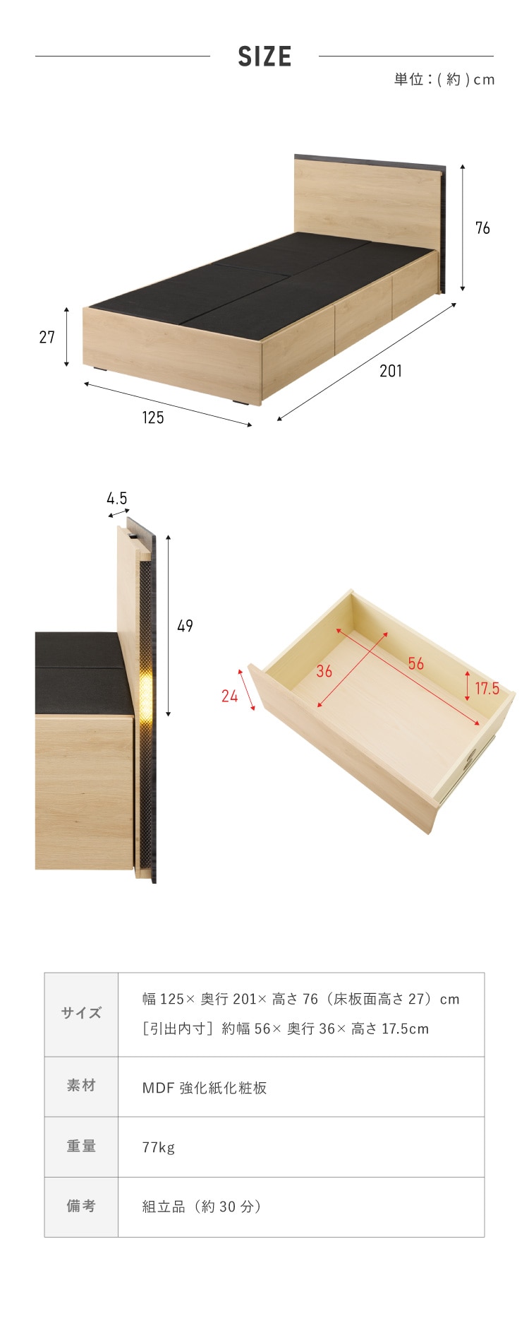 幅125×奥行201×高さ76(床板面高さ27)cm