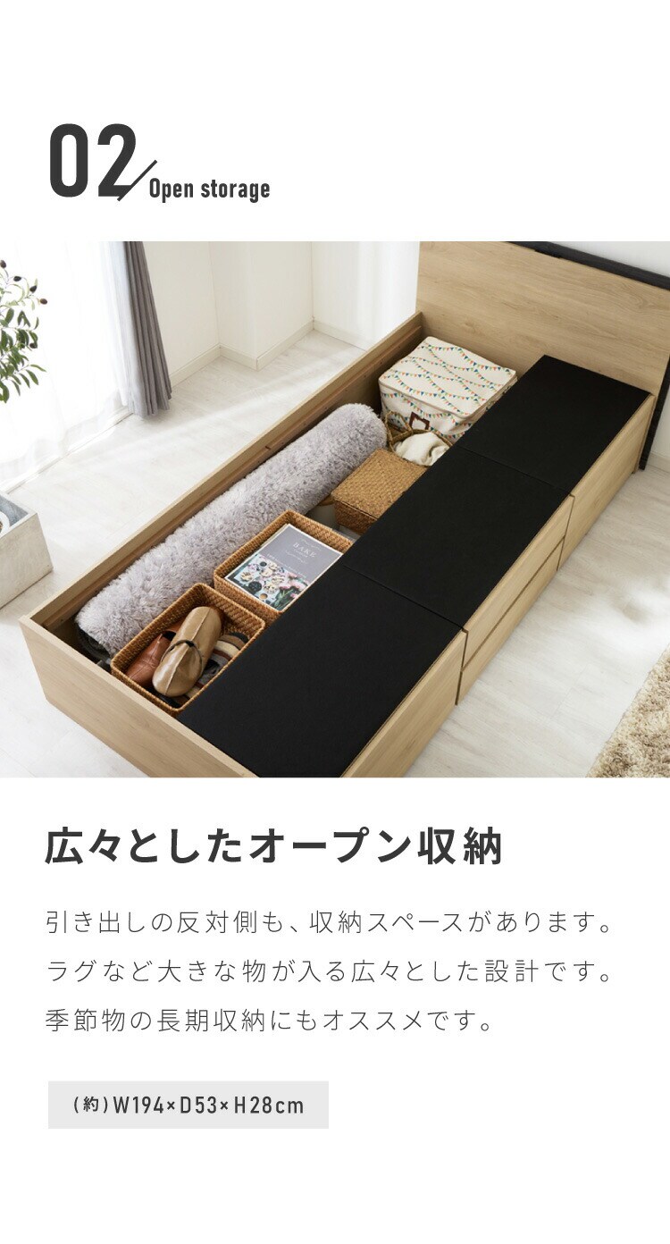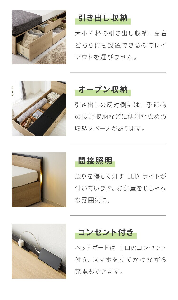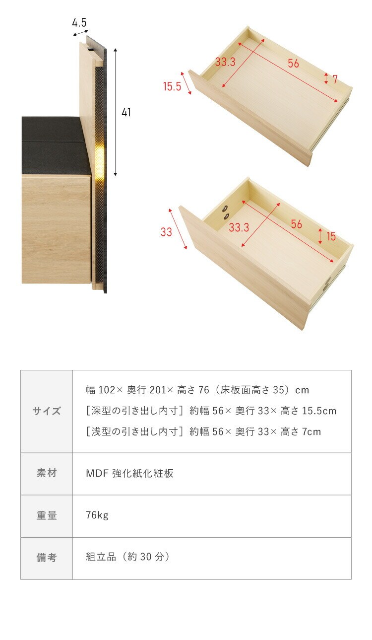 チェストベッド フレーム単品 シングルサイズ 幅102cm LEDライト付き コンセント付き 引き出し付き フルオープンレール仕様 収納 整理整頓 省スペース 有効活用 ベッド 新生活 1人暮らし【送料無料】