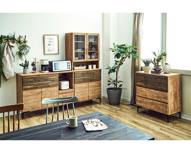 ・上二段引出前板は節有りパイン無垢材を使用しうづくり仕上げをしております。