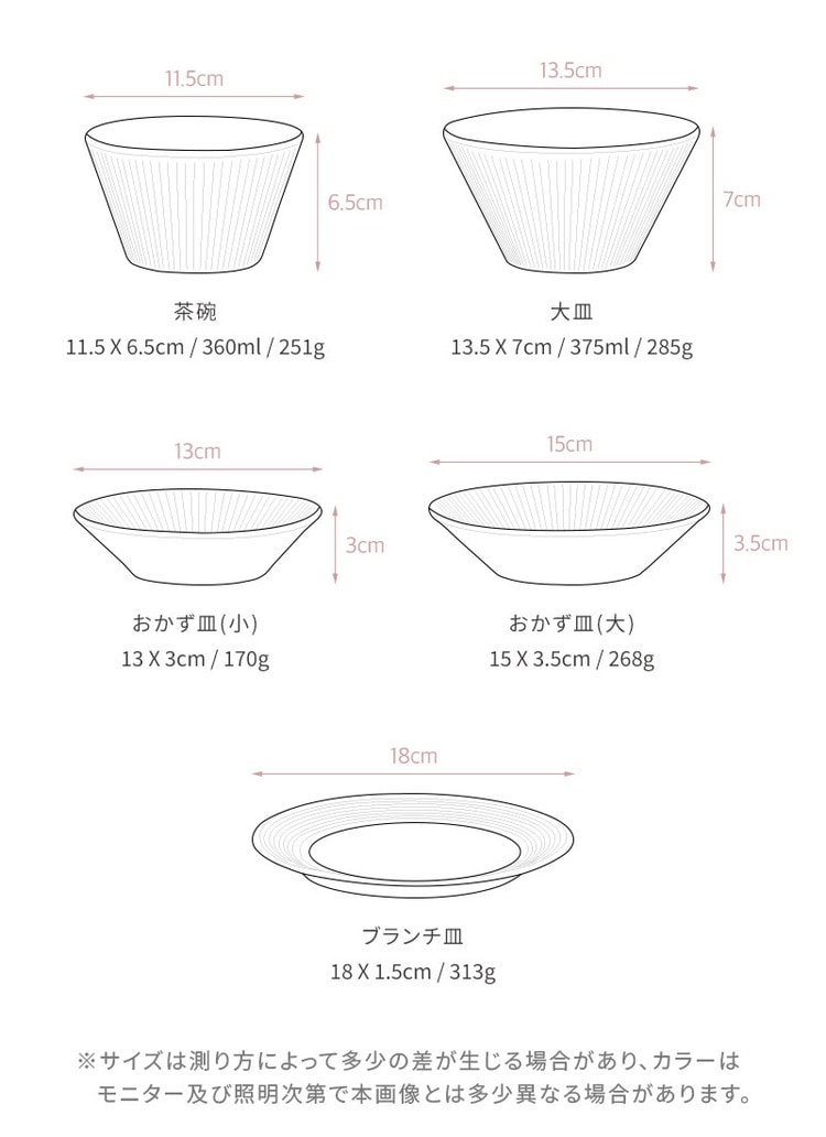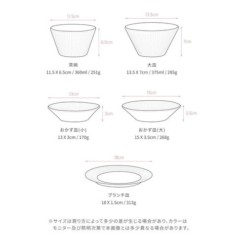 茶碗-1.5x6.5cm/350ml/251g、汁碗-13.5x7cm/375cm/285g、マグカップ-15x11.5cm/402g、皿(小)-13x3cm/170g、皿(大)-15x3.5cm/268g、ソースボール-8x3.5cm/127g、箸置き-8x2x1.2cm/36g、ブランチディッシュ-18x1.5cm/313g、ディナーディッシュ-23.5x1.8cm/611g、四角皿-27.5x12.3x2.5cm/502g