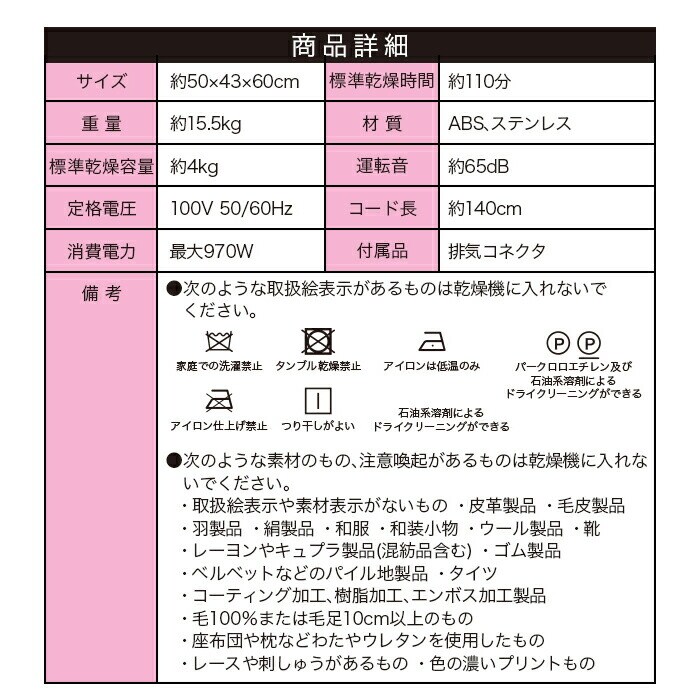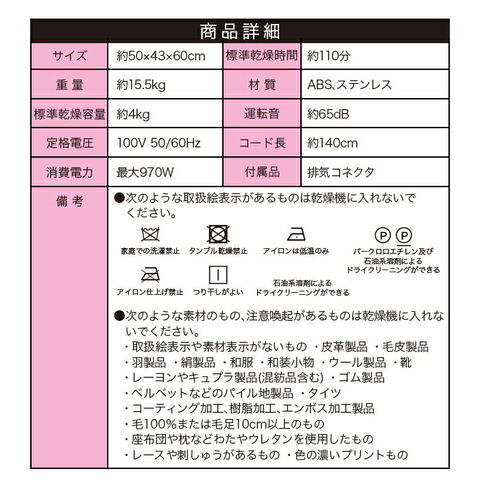標準乾燥容量:約4kg(乾燥時の布質量)